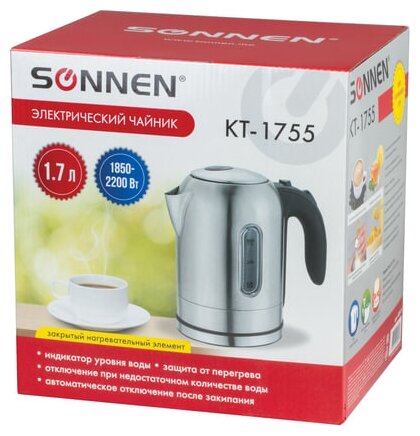 Чайник SONNEN KT-1755 1 7 л 2200 Вт закрытый нагревательный элемент нержавеющая сталь, 1 шт