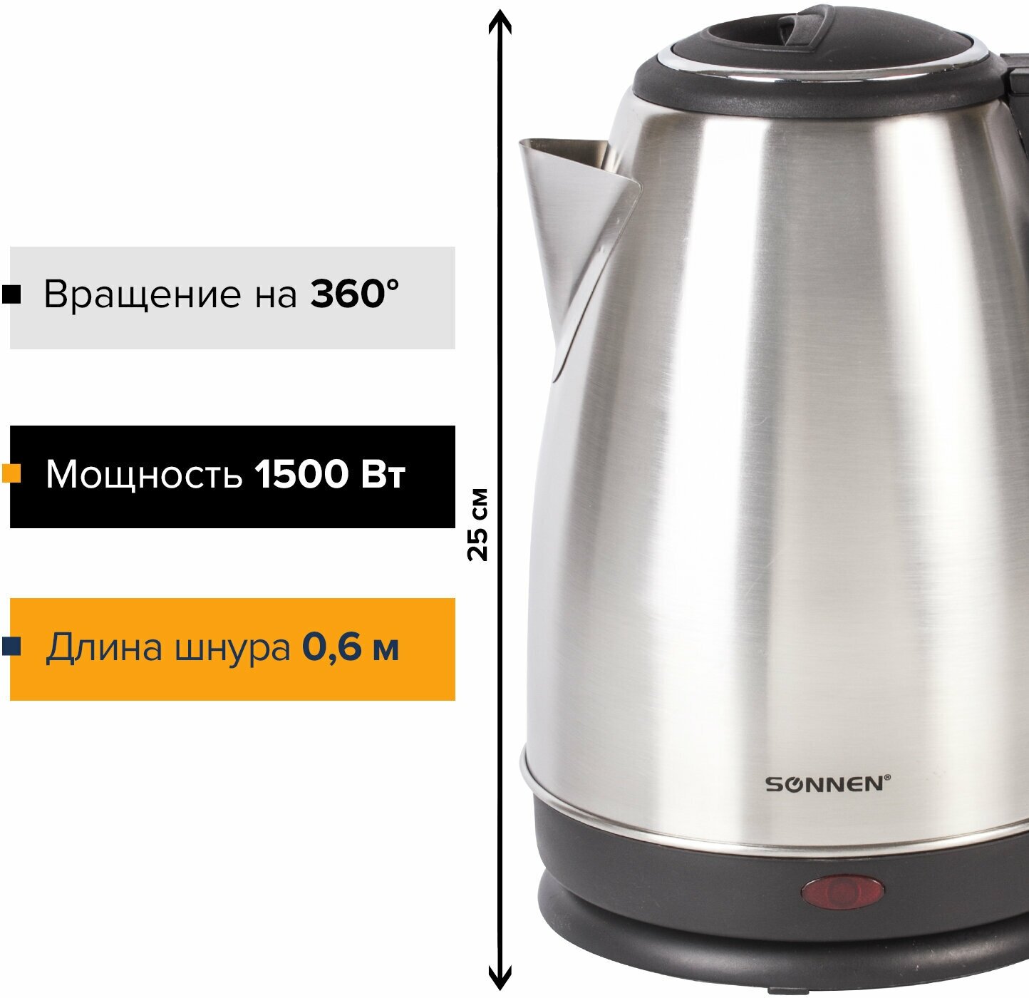 Чайник SONNEN KT-118, 1,8 л, 1500 Вт, закрытый нагревательный элемент, нержавеющая сталь, серебристый, 452926