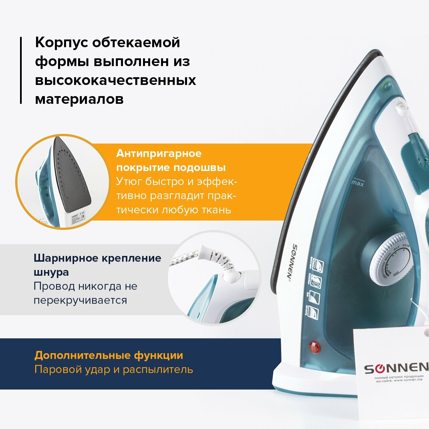 10 цен на Утюг Sonnen SI-227, 2000 Вт, антипригарное покрытие, бирюзовый, белый 453505