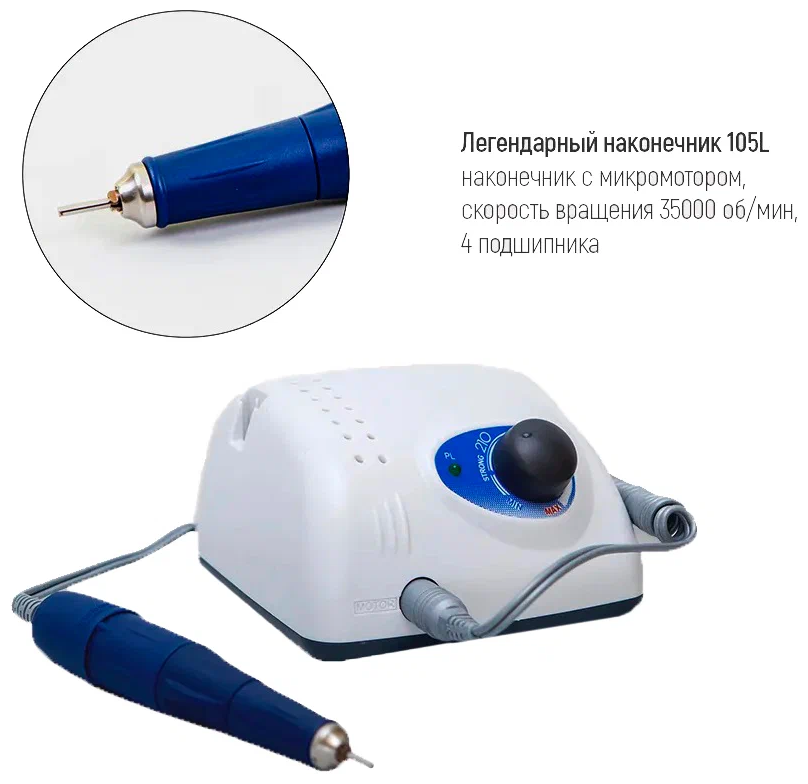 Аппарат для маникюра и педикюра Strong 210/105L в коробке, 35000 об/мин, 1 шт., белый/синий информация: