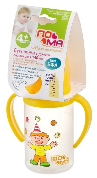 Пома Бутылочка 140 мл., Желтая, с ручками, 1шт. (ПП, силикон, средний поток) 4+ информация: