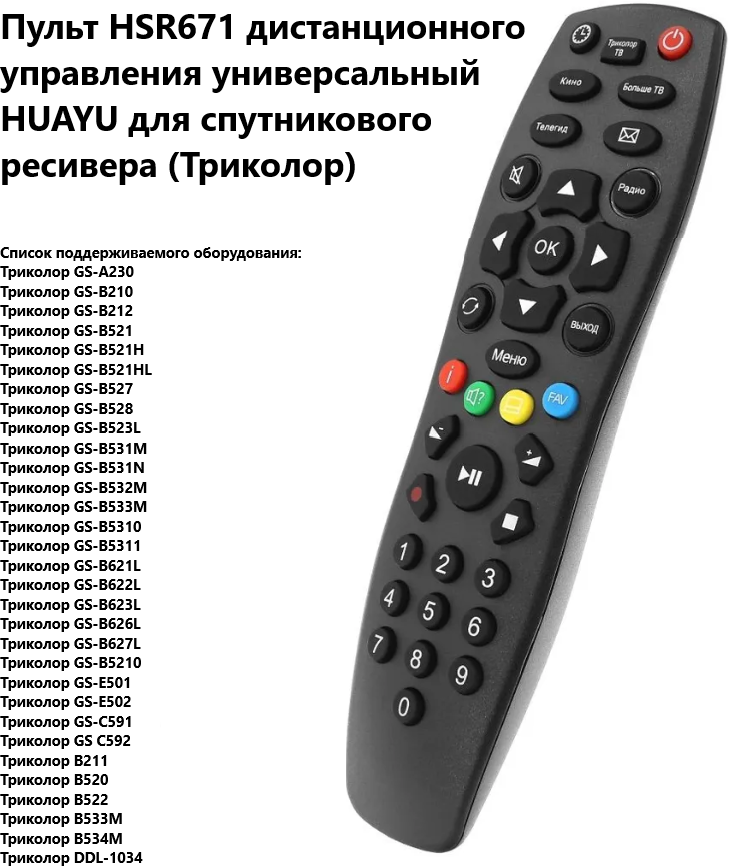 Пульт ДУ Huayu HSR671 для ресивера Триколор GS-212, черный информация: