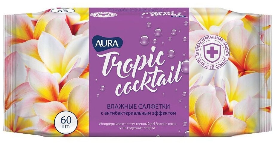 Влажные салфетки Aura Tropic Cocktail, c антибактериальным эффектом, 60 шт.