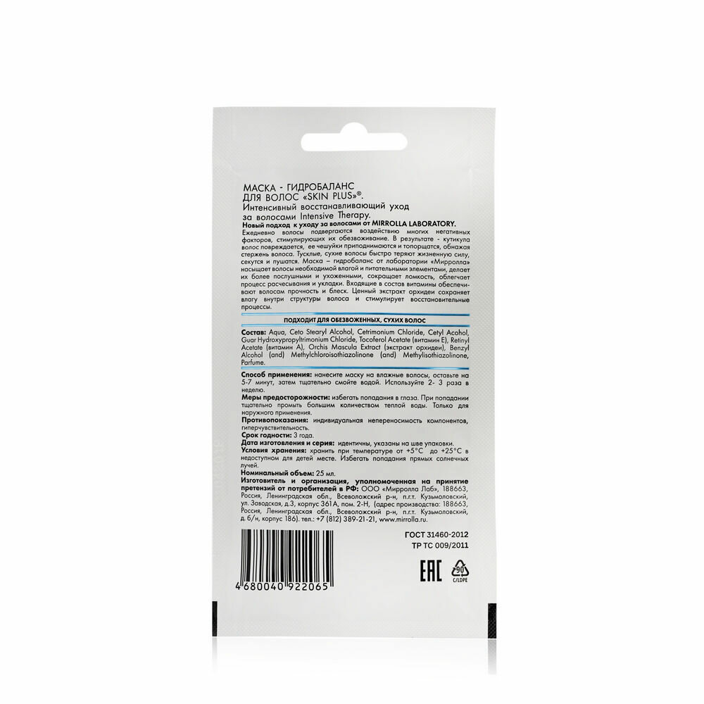 Маска для волос Гидробаланс Skin Plus, саше 25 мл. информация: