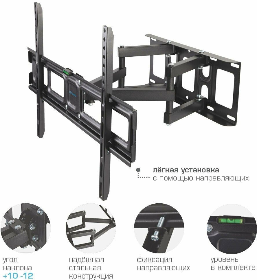 Кронштейн Tuarex OLIMP-606 black, настенный для TV 26-65, поворот 120, наклон +10-12, от стены 66-436мм, макс 45кг, VESA 600x400