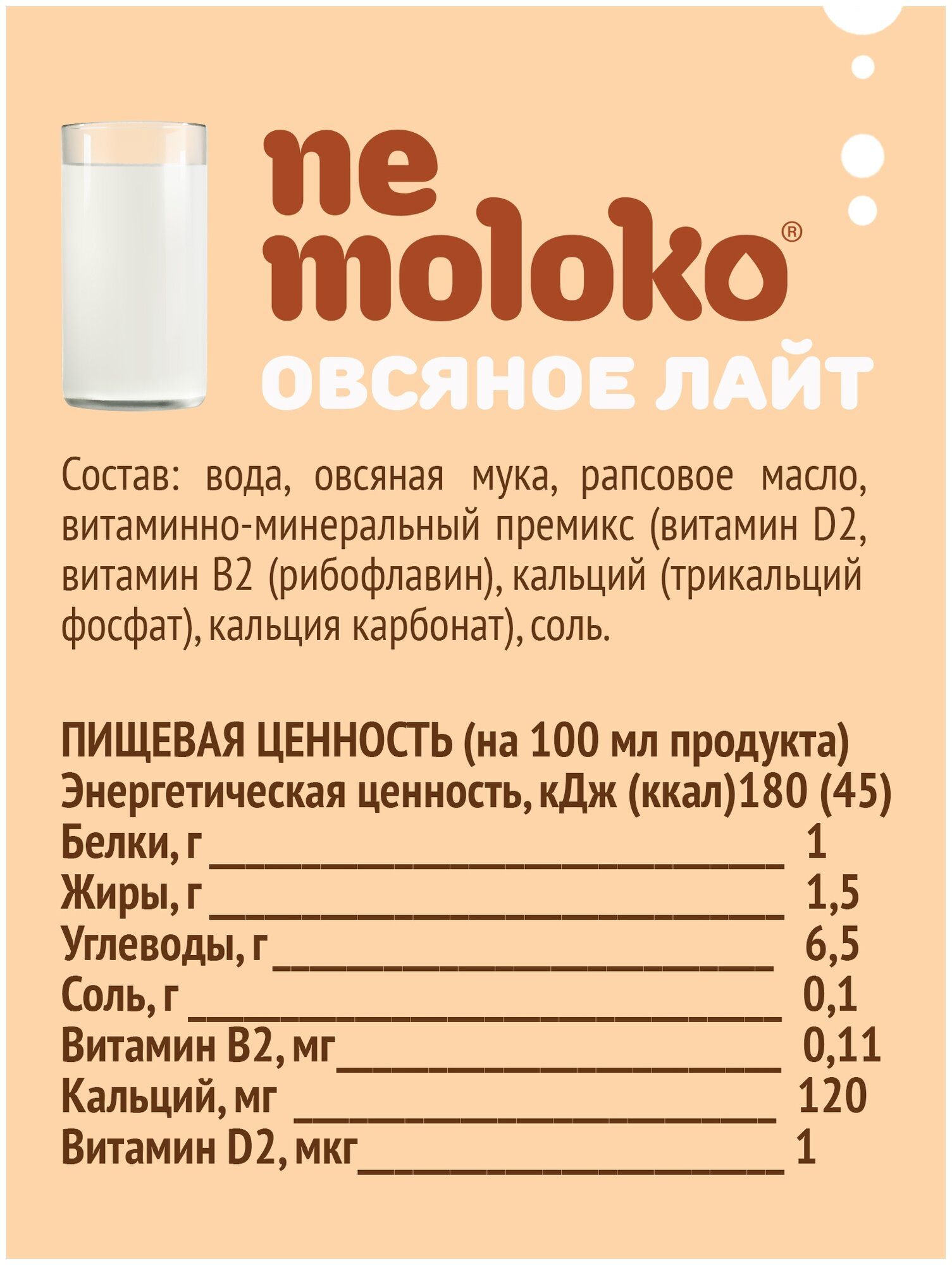 Напиток "Овсяный, классический, лайт" Nemoloko 1000 г 1000 мл информация:
