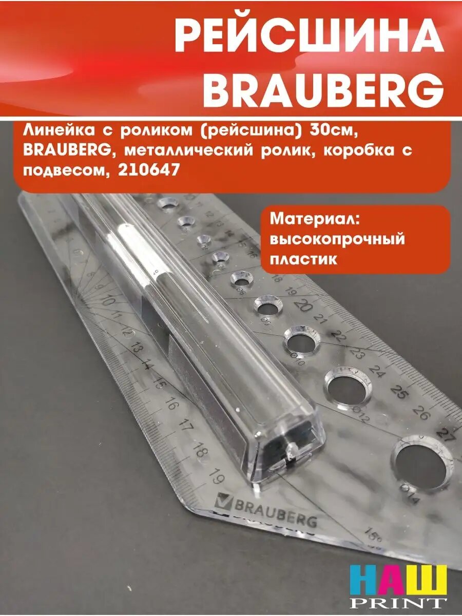 Линейка с роликом (рейсшина) 30 см, BRAUBERG, металлический ролик, коробка с подвесом, 210647 (цена за 1 ед.товара)