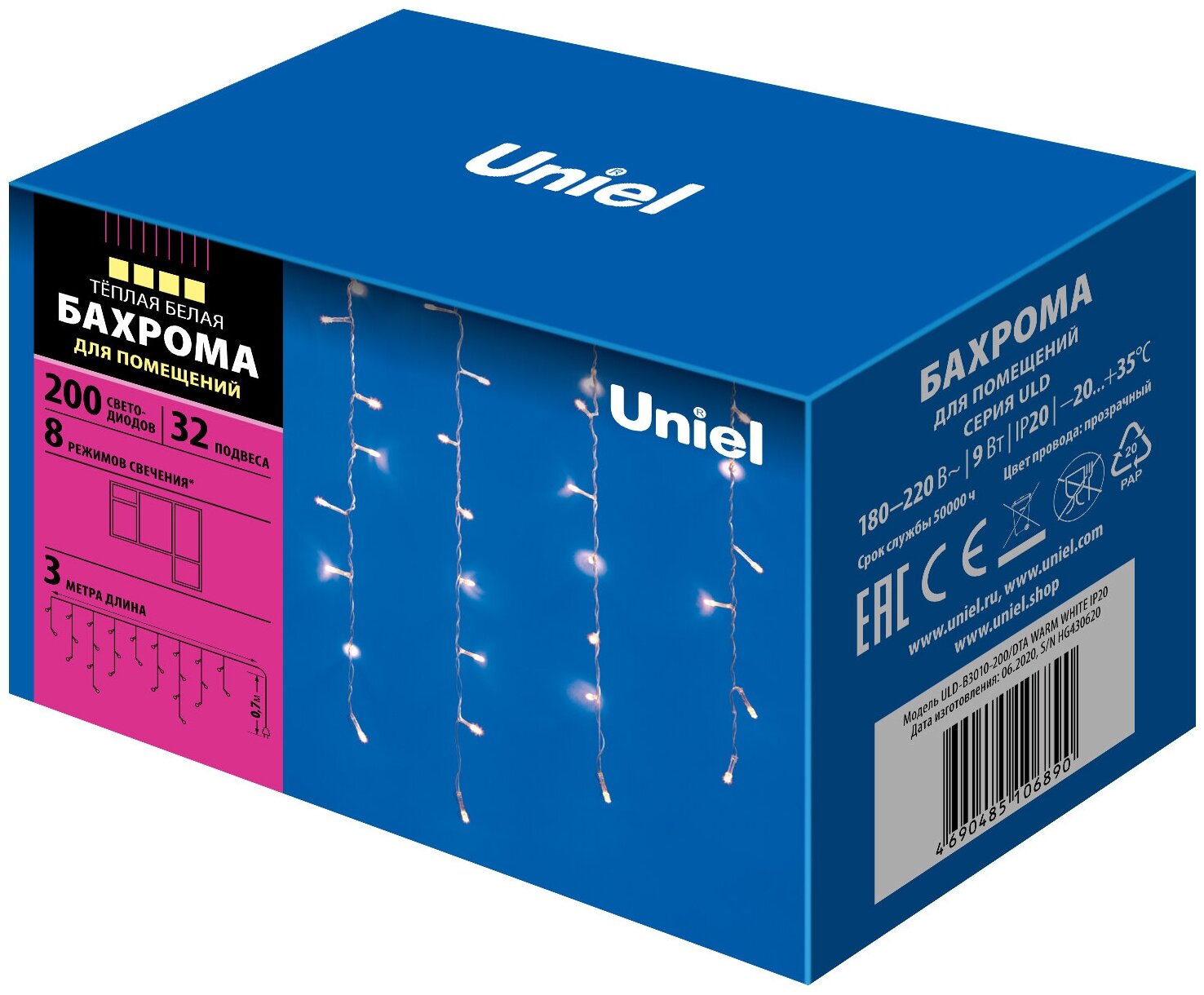 Типы/Новогодние товары/Гирлянды Uniel ULD-B3010-200/DTA WARM WHITE IP20 Бахрома светодиодная с контроллером, 3 м. 200 светодиодов. Теплый белый свет. Провод прозрачный. TM Uniel. информация: