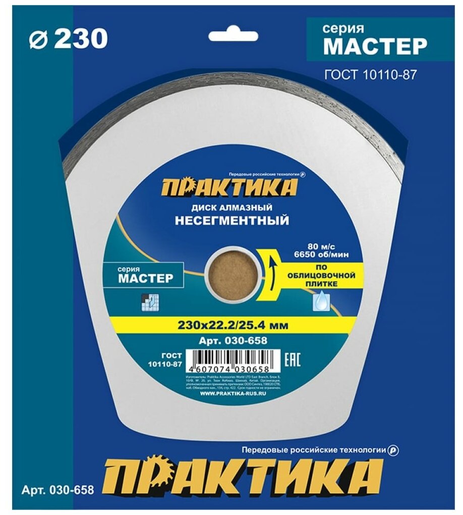 Диск алмазный ПРАКТИКА 030-658 несегментный "Мастер" 230 х 25,4/22 мм (1шт) коробка