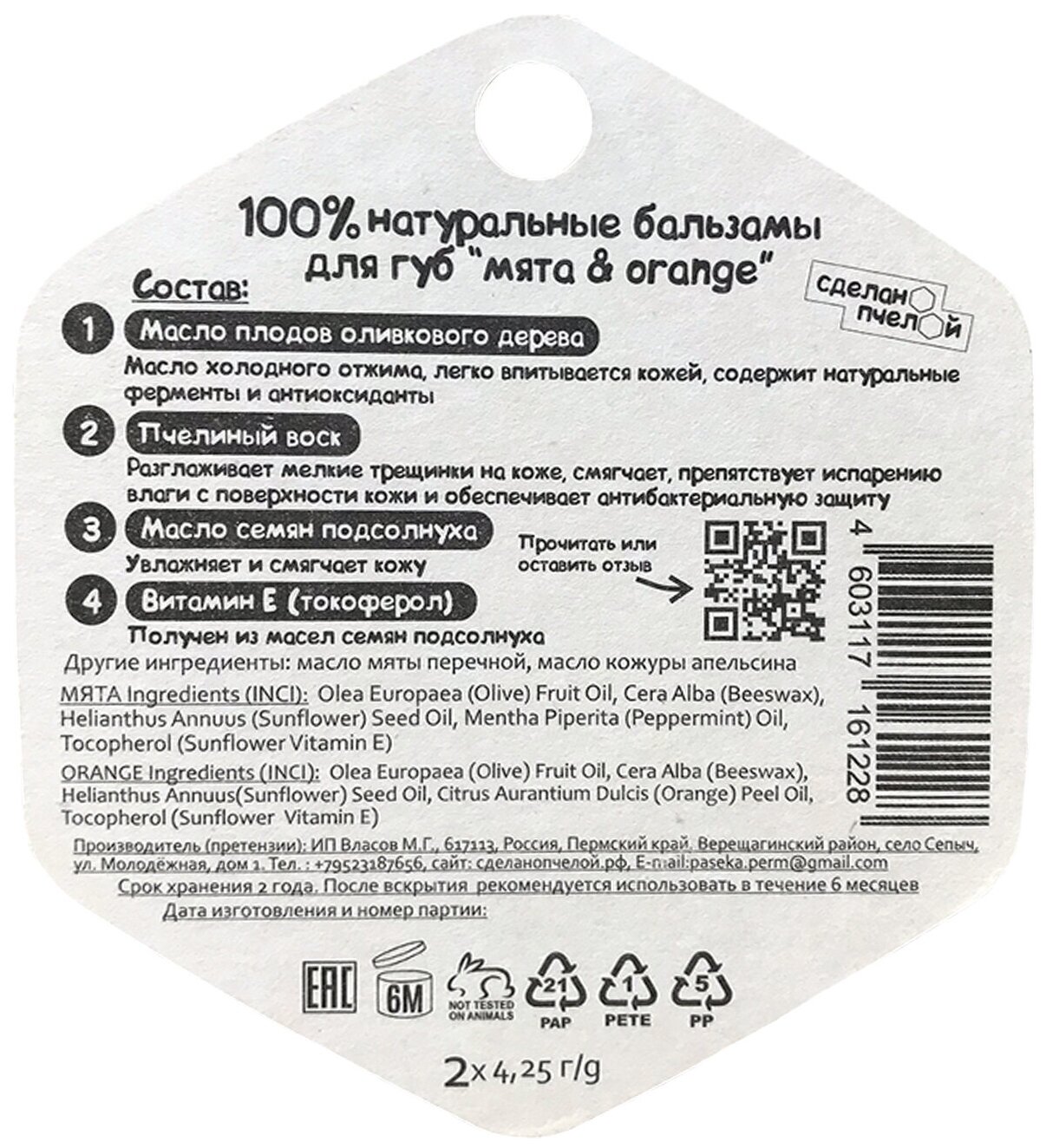 10 цен на Бальзамы для губ "Мята & Ogange", с пчелиным воском Сделано пчелой 2 шт по 10 мл