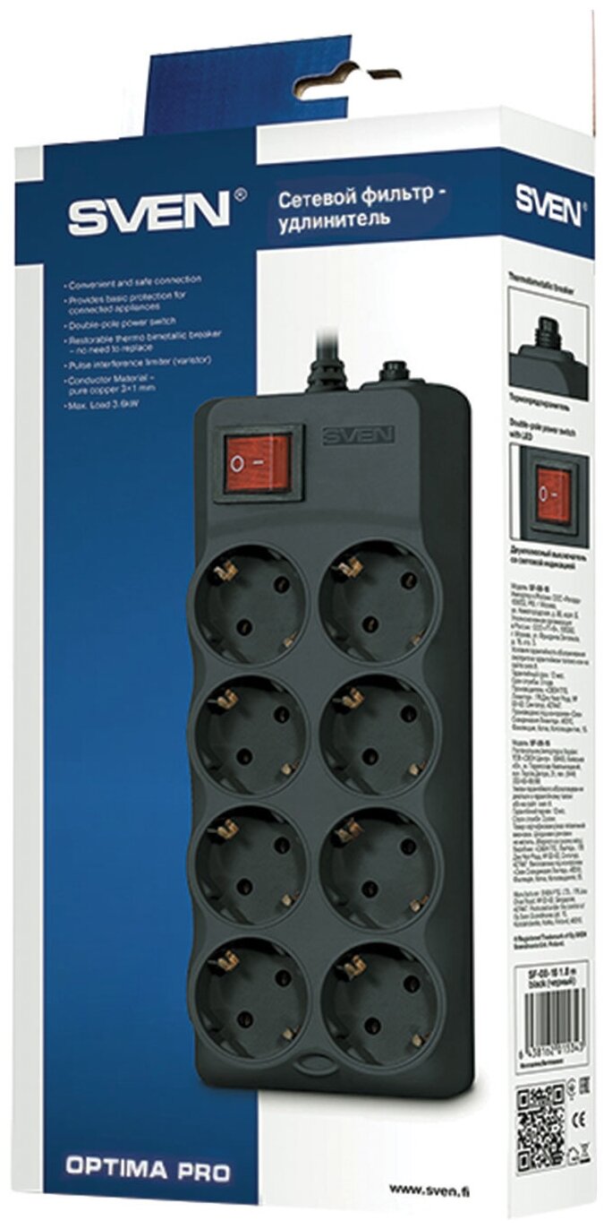 Фильтр SVEN SF-08-16 3,0 м (8 розеток 16А) черный, цветная коробка