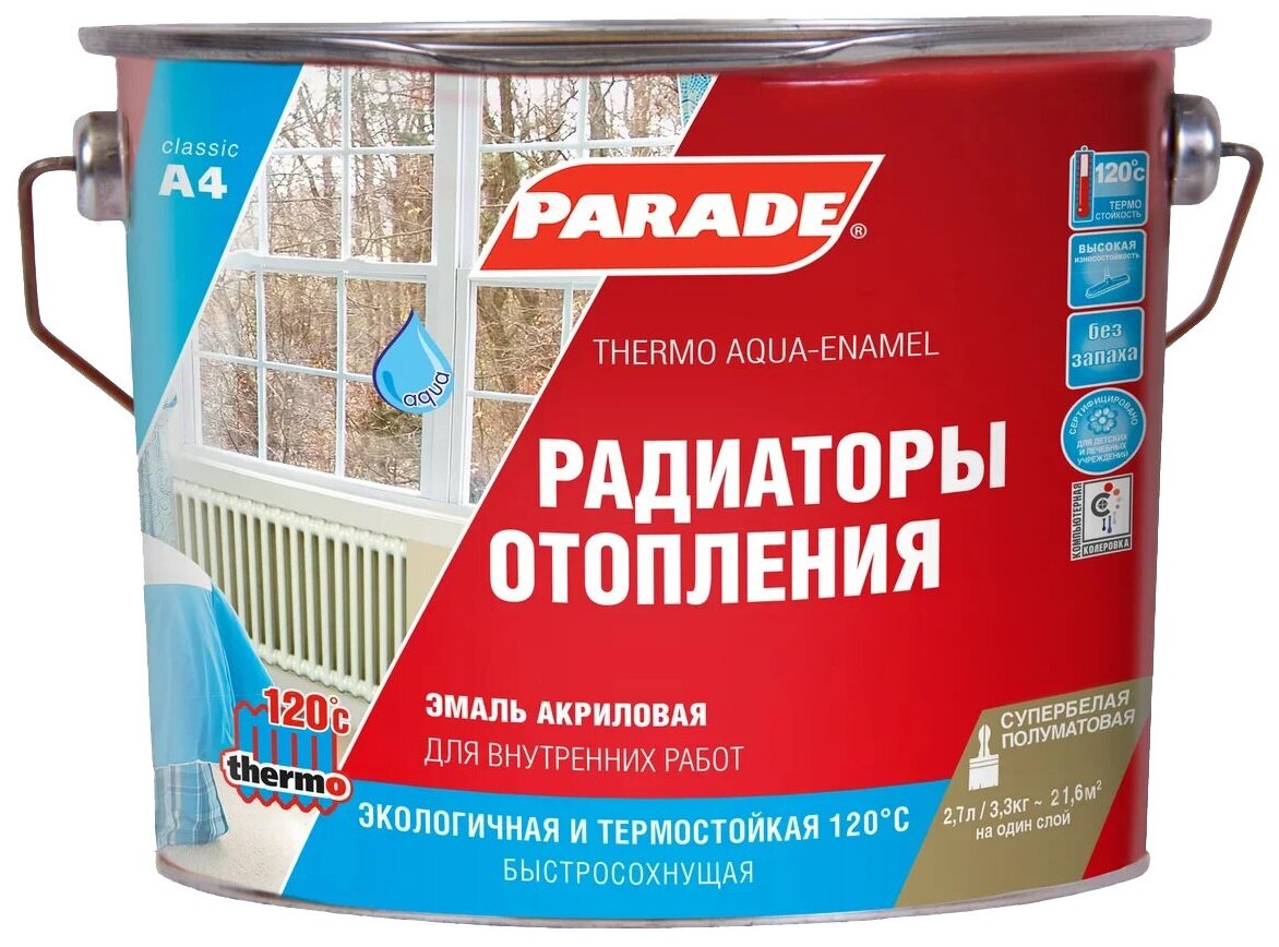 Эмаль PARADE А4 Радиаторы отопления акриловая термо белый полуматовый 2,7 л информация: