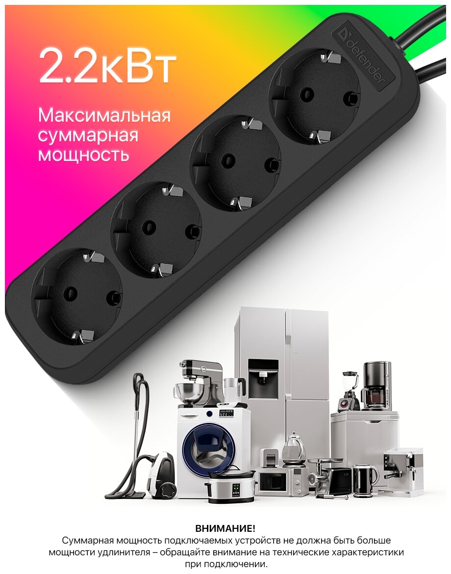 Удлинитель электрический Defender М430, 3,0 м, 4 розетки, с заземлением, цвет: чёрный