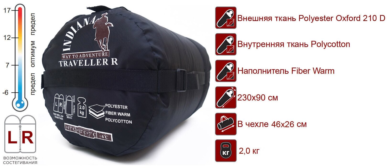 Спальный мешок INDIANA Traveller R-zip от -6 °C (одеяло с подголовником 230+35X90 см) информация: