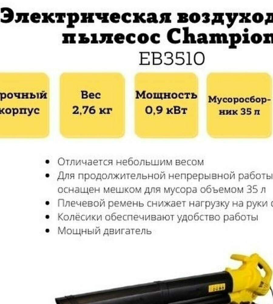 Отзывы на Воздуходувка-пылесос электрическая CHAMPION EB3510 (900 Вт 2,76кг 792 м³/ч 75м/с 35л )