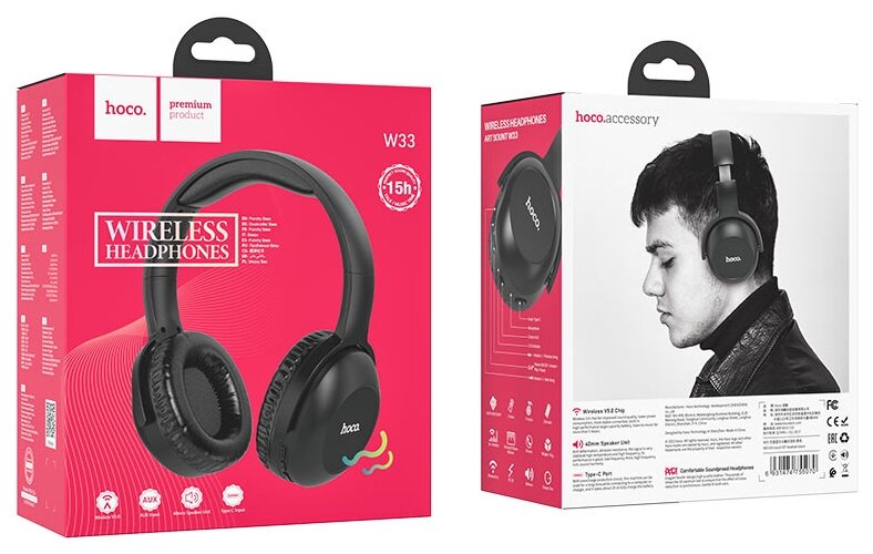 Отзывы на Наушники беспроводные, полноразмерные с микрофоном Bluetooth, 250mAh, 10 часов музыки, AUX hoco. W33 Art sount - черный