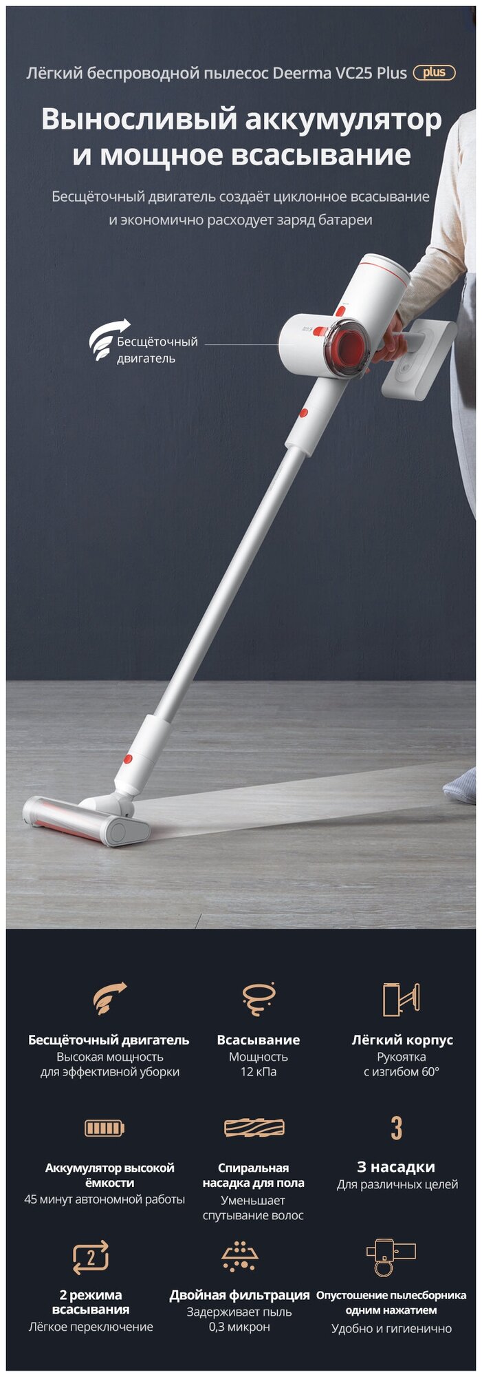 Deerma VC25 PLUS Беспроводной вертикальный мощный ручной пылесос, уборка шерсти домашних животных, суббренд xiaomi информация: