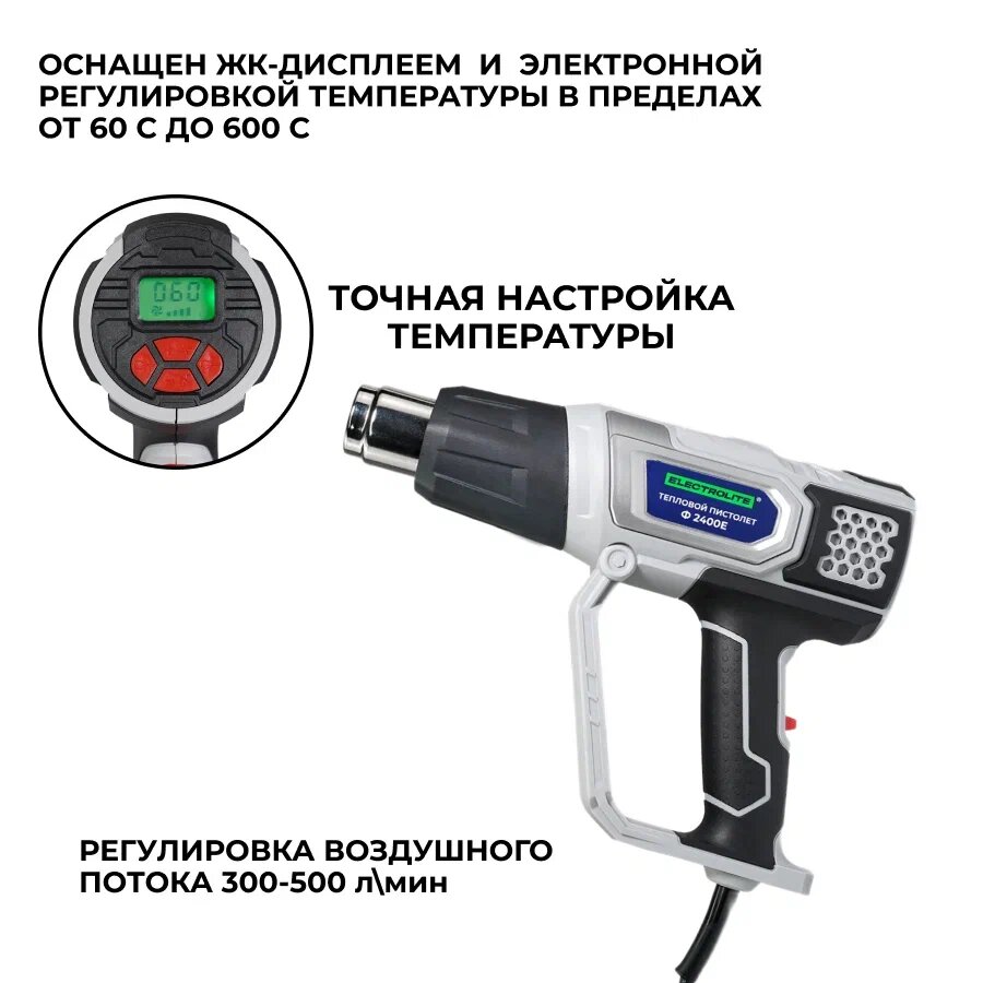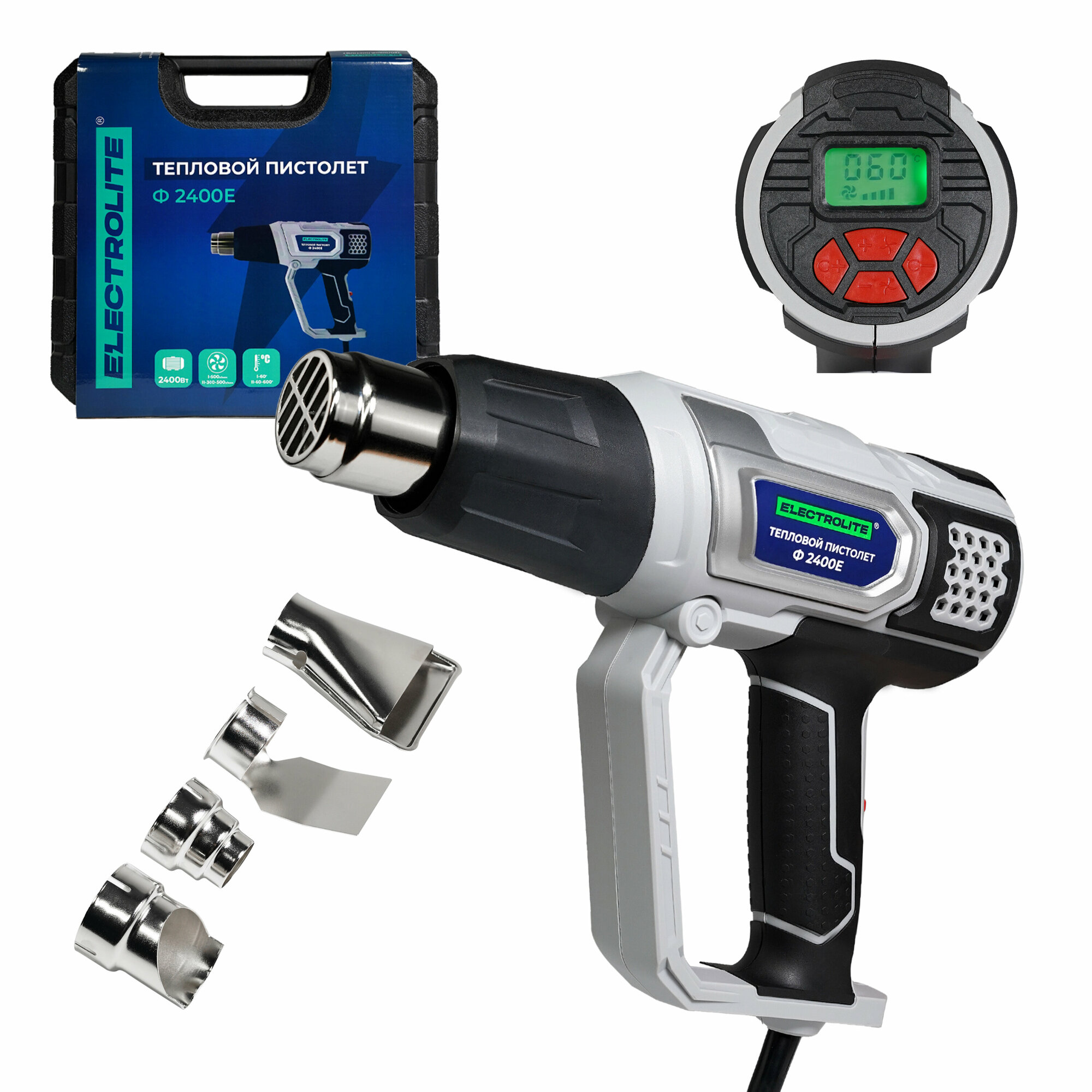Строительный фен Electrolite Ф 2400E 2400 Вт, 600 С, 500 л/мин, ЖК-дисплей, 4 насадки, кейс