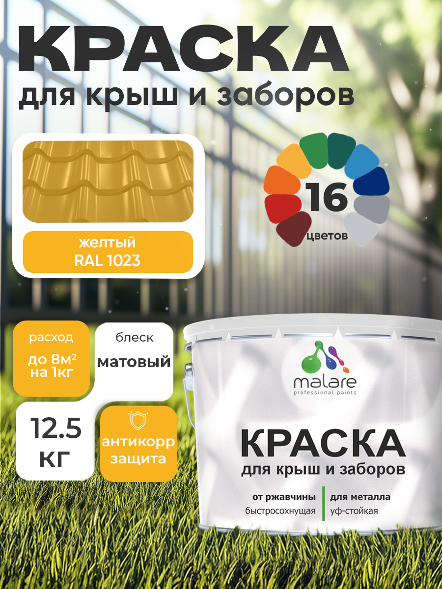 Краска Malare для металлического забора, для крыши из металла, для металлочерепицы, антикоррозионная, матовый, жёлтый, 12,5 кг. информация: