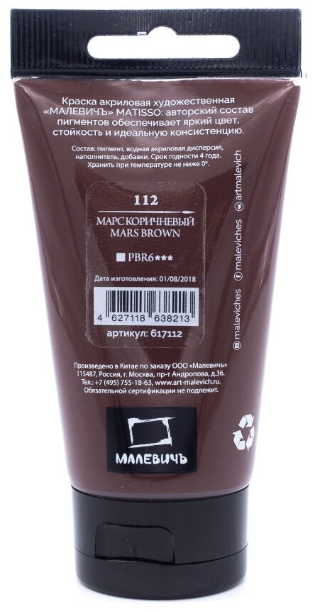 Краска акриловая Малевичъ Matisso, марс коричневый, 60 мл информация: