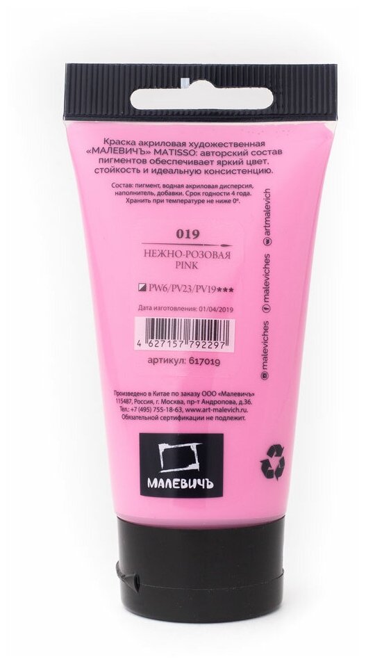 Краска акриловая художественная 1 цвет, 60мл, цвет розовый, туба ПВХ Matisso Малевичъ 617310 - 1 шт.