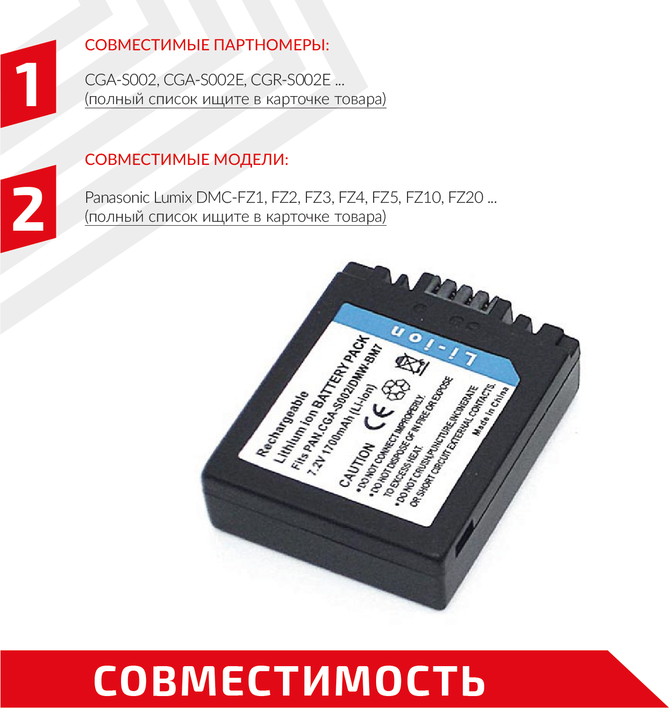 | Совместимый аккумулятор | CGR-S002 / CGR-S002E / DMW-BM7 / CGA-S002 / CGA-S002A / CGA-S002A/1B / CGA-S002E / CGA-S002E/1B / PL77U.563 |