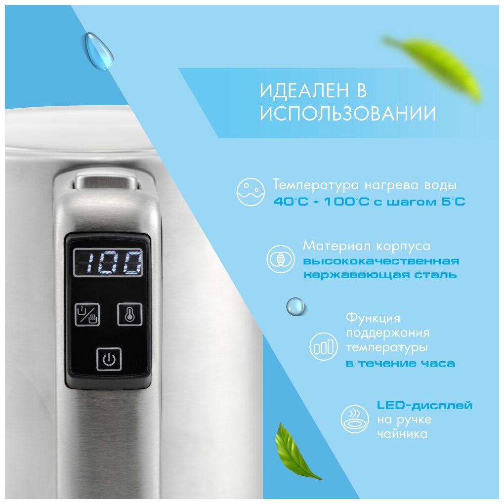 | Дополнительная информация | защита от перегрева, автоматическое / ручное выключение; выбор температуры нагрева воды: 40°С - 100°С с шагом 5°C; LED-дисплей на ручке чайника |
