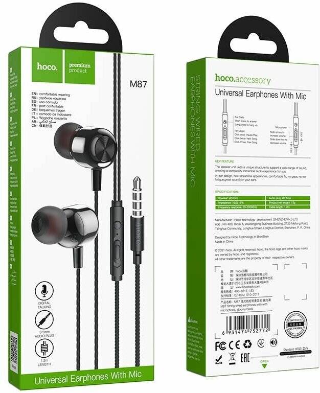 Наушники вакуумные для AUX разъема с микрофоном и регулятором громкости длина 1.2м Hoco M87 Gloomy Black