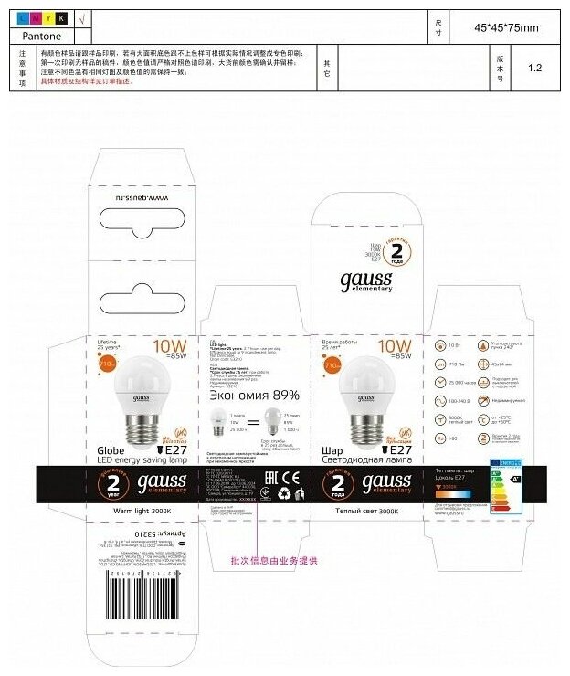 10шт/уп. Лампа LED Шар 10Вт 230B P45 E27 710Лм 3000К Свет Теплый белый арт. 53210 Gauss, уп. 10шт 2 447 ₽