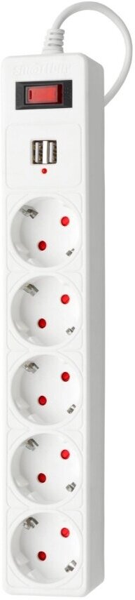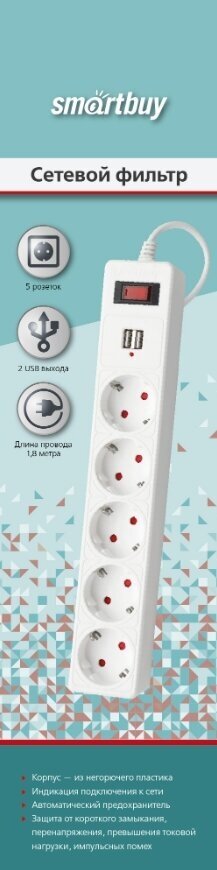 Сетевой фильтр с USB, 10А, 2 200 Вт, 5 розеток, длина 1,8 м, белый (SBSP-18U-W)1/45 информация: