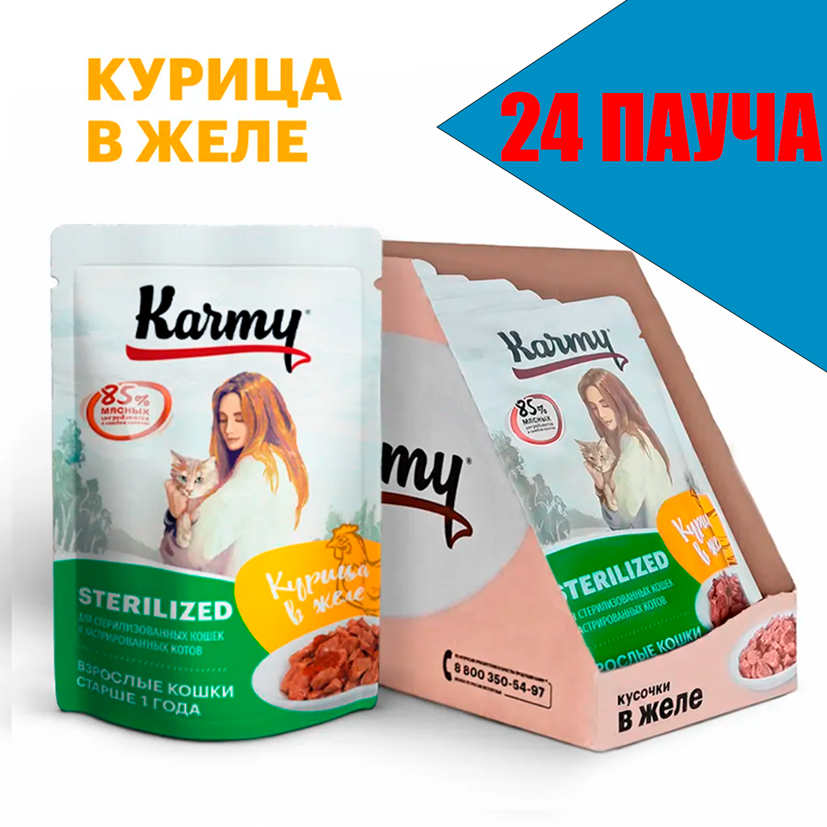 Влажный корм для стерилизованных кошек Karmy с курицей 24 шт. х 80 г (кусочки в желе)
