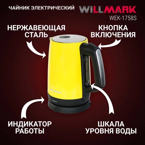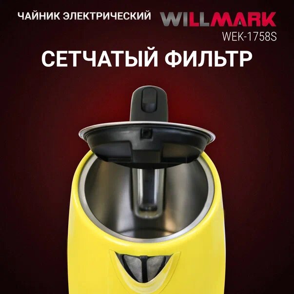 10 цен на Чайник эл. WILLMARK WEK-1758S (1.7л, нерж.сталь, смотр.окно, пов.на 360 град.,сетч.фильтр, 2200Вт)