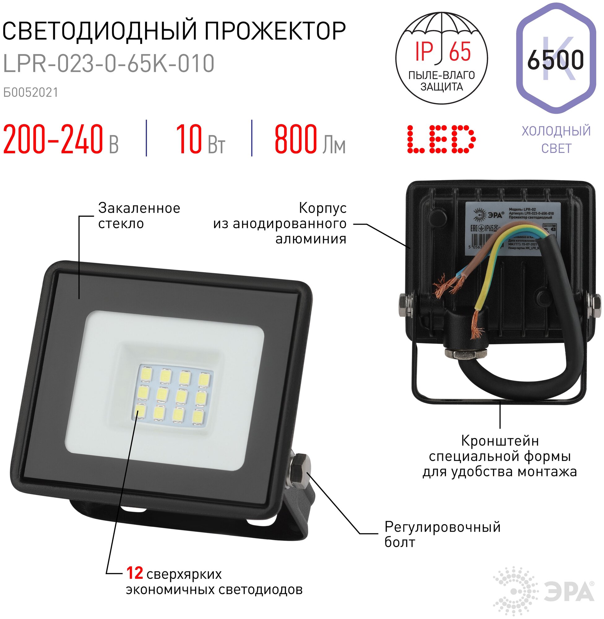 ЭРА Прожектор светодиодный LPR-023-0-65K-010 10Вт 6500К 800лм IP65 81х75х21.5 уличный Эра Б0052021 информация: