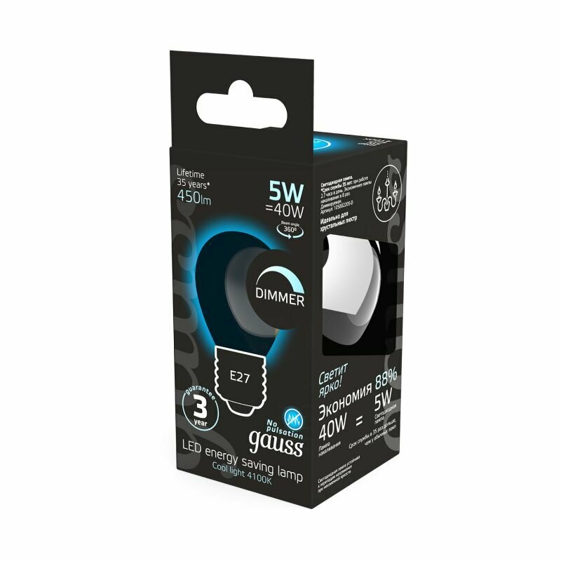 Лампа светодиодная gauss 105802205-D, E27, G45, 5 Вт, 4100 К информация: