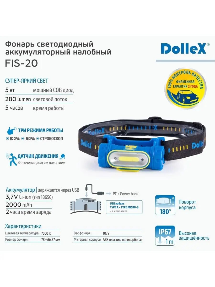 DOLLEX FIS20 Фонарь DOLLEX налобный аккум Li-ion 3.7V 2000mA COB 5W датчик движения стробоскоп 4 070 ₽
