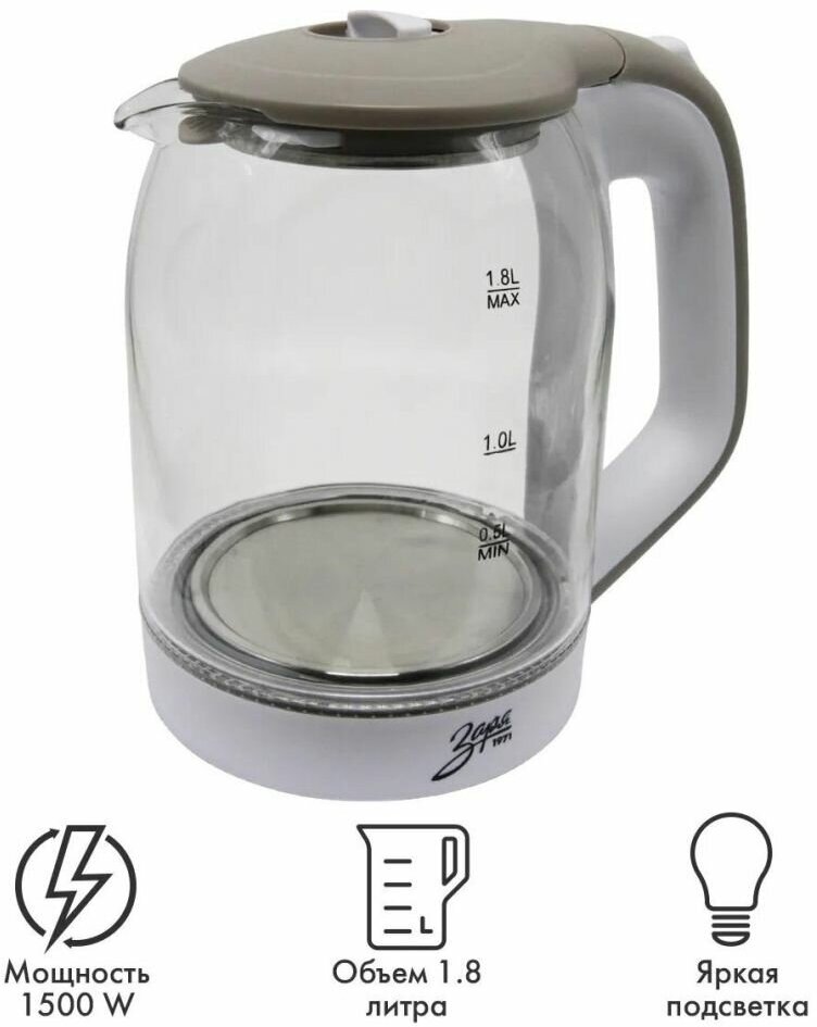 Электрический чайник Заря 258-01 1.8 л / стеклянный / с подсветкой / дисковый ТЭН / автоотключение / поворот на 360 / электрочайник / 1500 Вт / белый 2 416 ₽
