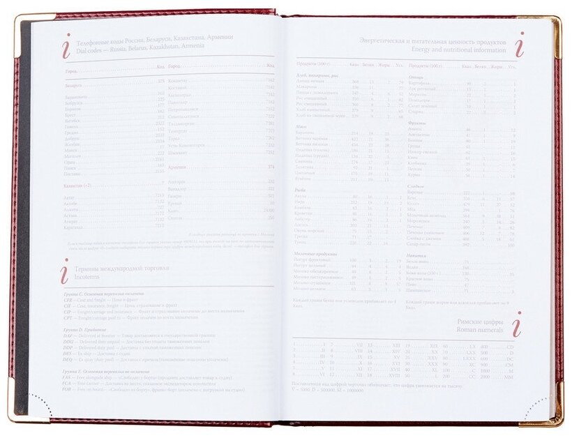 | Особенности | металлические уголки на обложке / справочная информация / ляссе / прошивка по периметру обложки / цветной обрез |