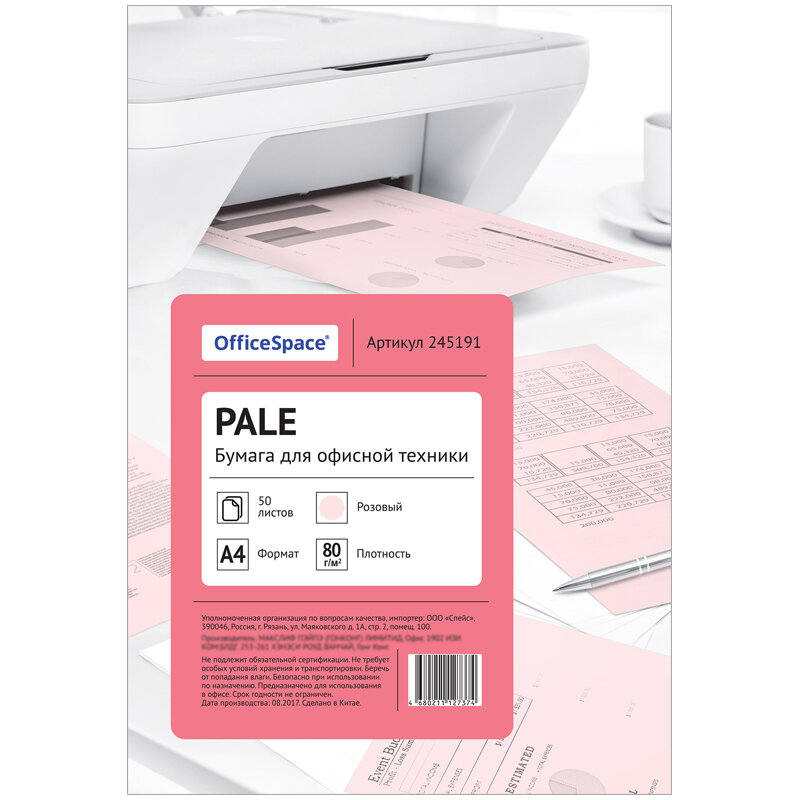 Бумага цветная OfficeSpace pale А4, 80г/м2, 50л. (розовый), 245191 449 ₽