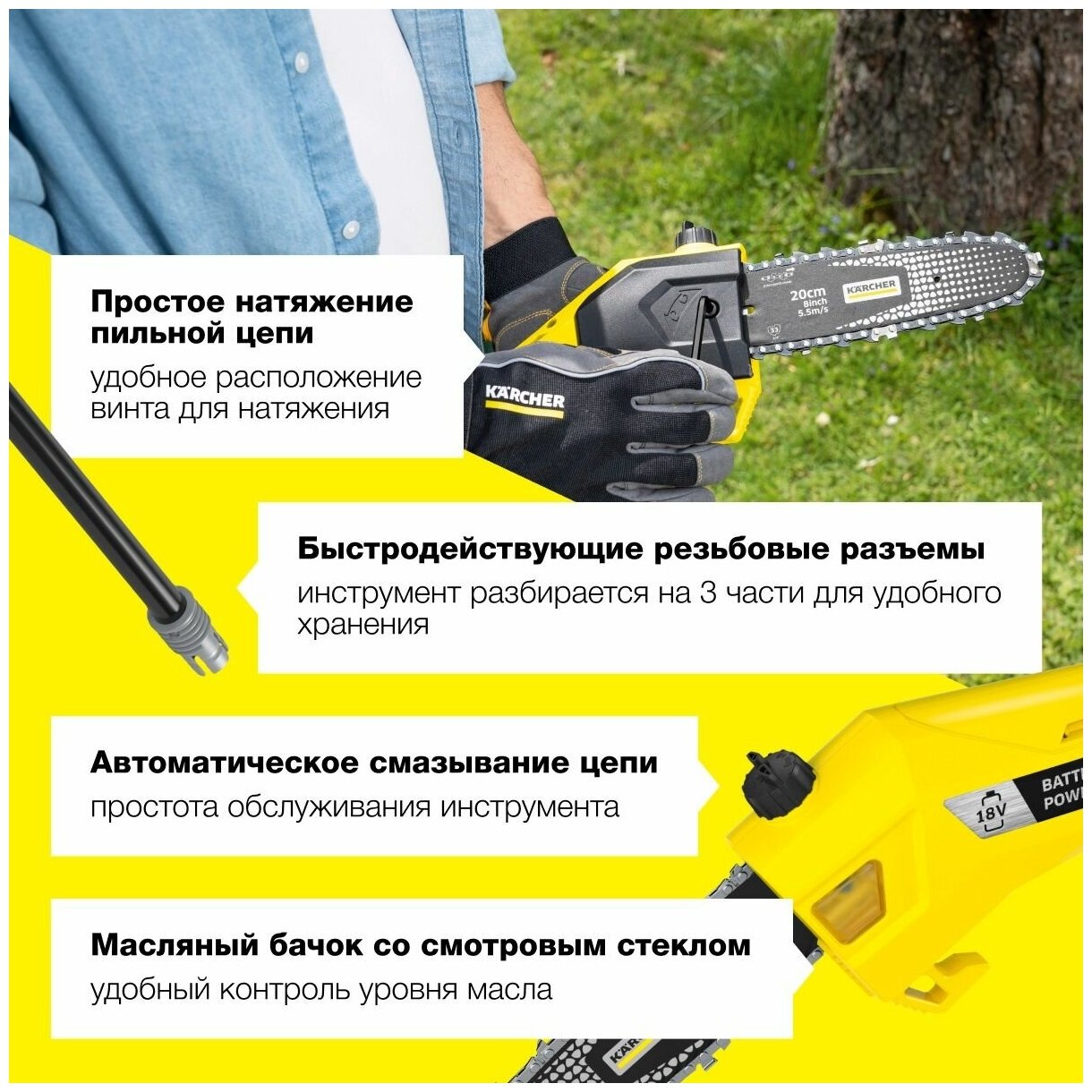 Высоторез аккумуляторный для деревьев Karcher PSW 18-20 (1.444-010.0) 18В Li-Ion с телескопической рукояткой без АКБ и ЗУ