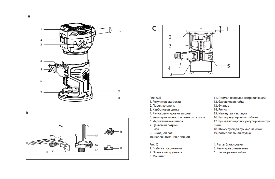 | Комплектация | параллельная направляющая, роликовый упор, цанга 6 мм и 8 мм, копировальная втулка, ключи, инструкция |