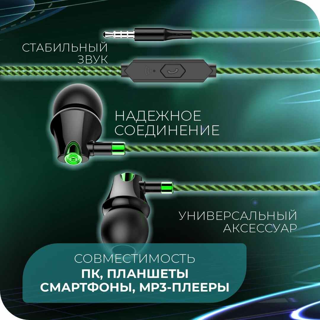 Наушники MORE CHOICE G26 проводные, вакуумные, 1,1м, черный/зеленый