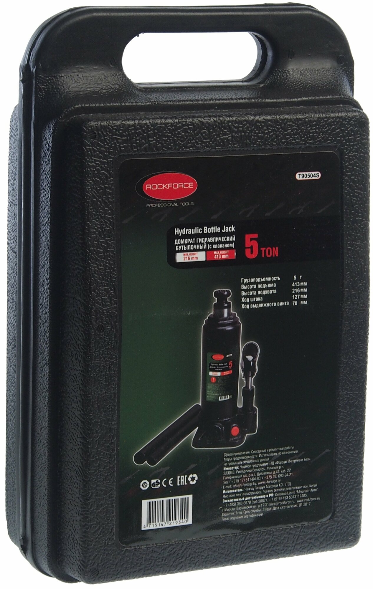 Домкрат бутылочный 5т 216-413мм с клапаном в кейсе ROCKFORCE RF-T90504S