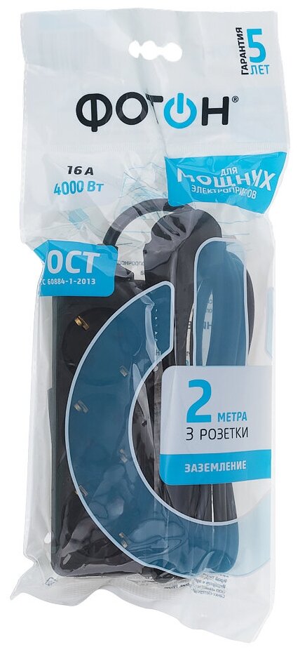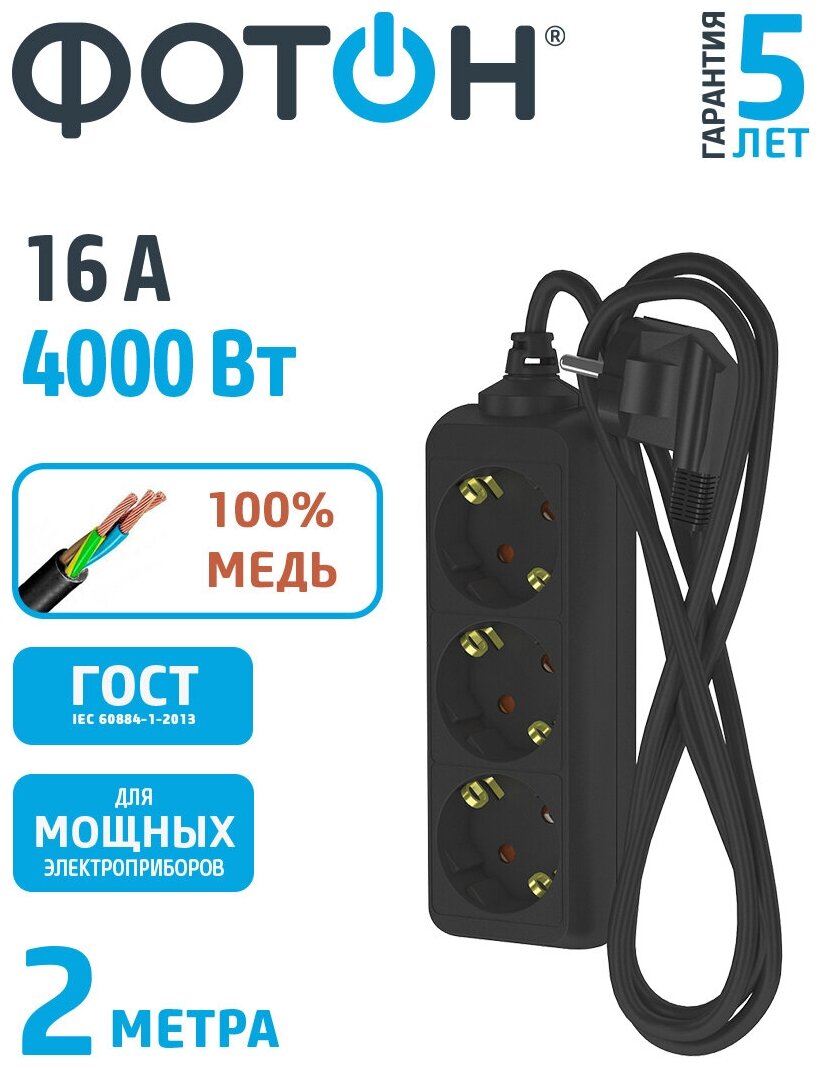 Отзывы на Удлинитель сетевой "фотон" 16-23Е Для дома 2м, 16А, 3 розетки с заземлением, черный