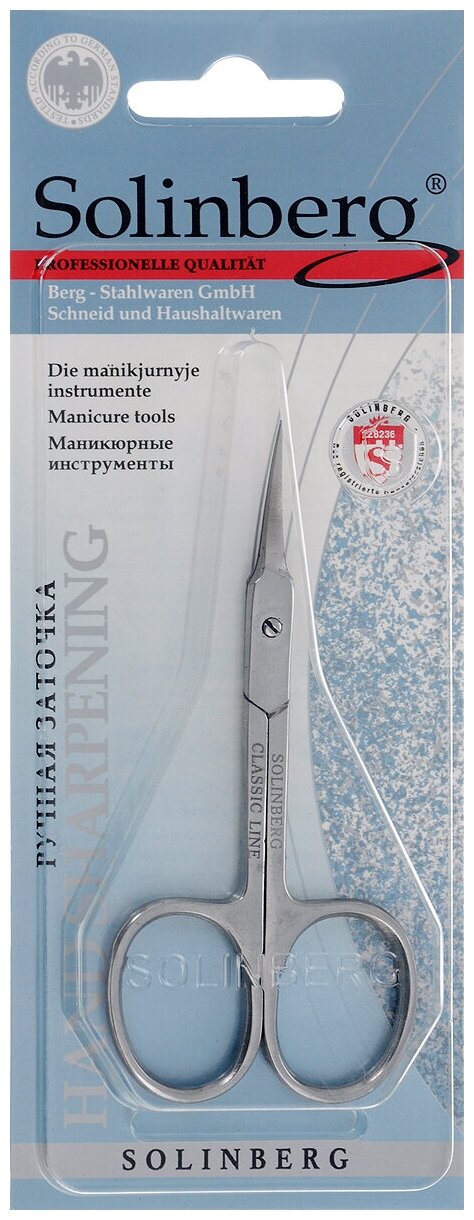 Solinberg Ножницы маникюрные, для кутикулы, загнутые, узкие, 10 см, в блистере, цвет матовый серебристый, 62000/2