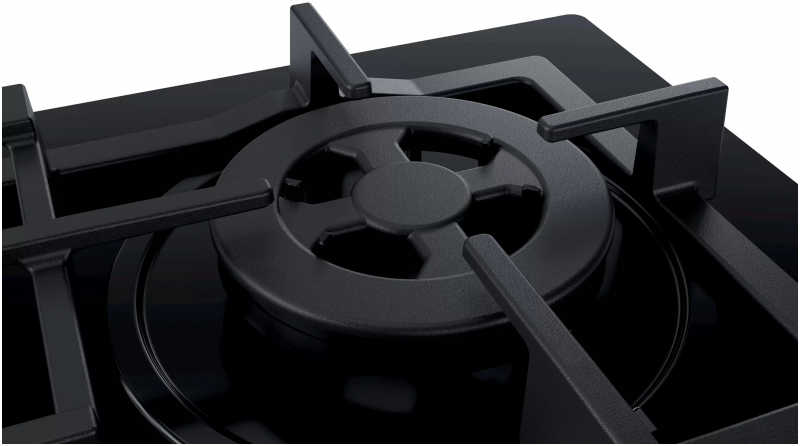 Варочная панель Bosch Serie 4, газовая 60см, закаленное стекло, черный, 4 конфорки, 1 конфорка WOK c 2 контурами пламени, индивидуальные чугунные решетки, газ-контроль, автоматический электроподжиг, сделано в Испании
