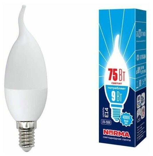 10 цен на Volpe LED-CW37-9W/NW/E14/FR/NR Лампа светодиодная. Форма "свеча на ветру", матовая. Серия Norma. Белый свет (4000K). Картон. ТМ Volpe