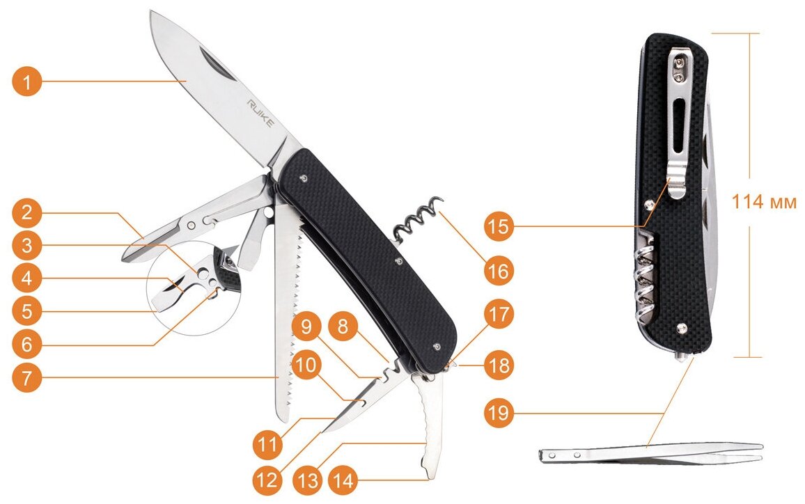 | Инструменты (функции) | нож / ножницы / отвертка / открывалка для бутылок / пила / пинцет / шило / кернер / штопор |