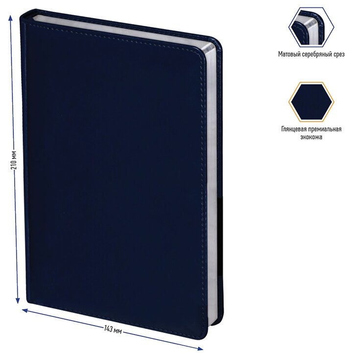 Ежедневник недатированный А5, 160 листов, Berlingo "Silver Pristine". Блокнот/ планер/ записная книжка в линейку, под кожу, серебряный срез, синий, в подарок
