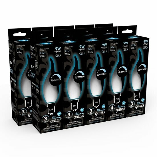 Отзывы на Светодиодная лампа Gauss Filament Свеча на ветру 9W 610lm 4100К Е14 milky диммируемая LED 1/10/50