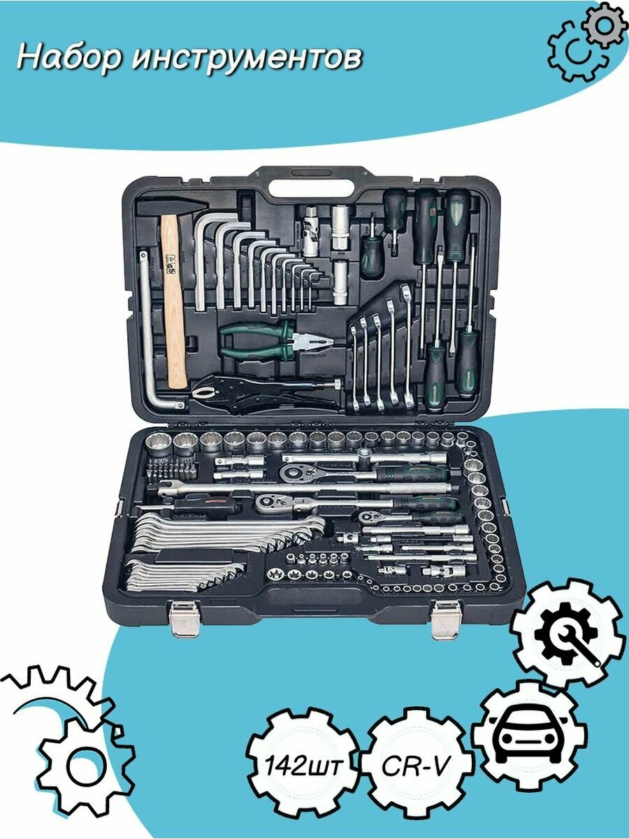 | Инструменты в комплекте | вороток для головок / ключи гаечные / ключи имбусовые (шестигранные) / молоток / отвёртки / пассатижи / рукоять для бит / рукоять для головок / трещотка |
